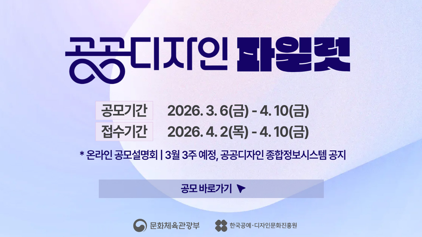 공공디자인 아이디어 기획부터 제작까지! 디자인 개발의 전 과정을 지원합니다. 공공디자인 혁신 아이디어 발굴부터 디자인 개발 및 실증에 관심 있는 디자인 스튜디오와 연구소의 많은 참여 바랍니다.