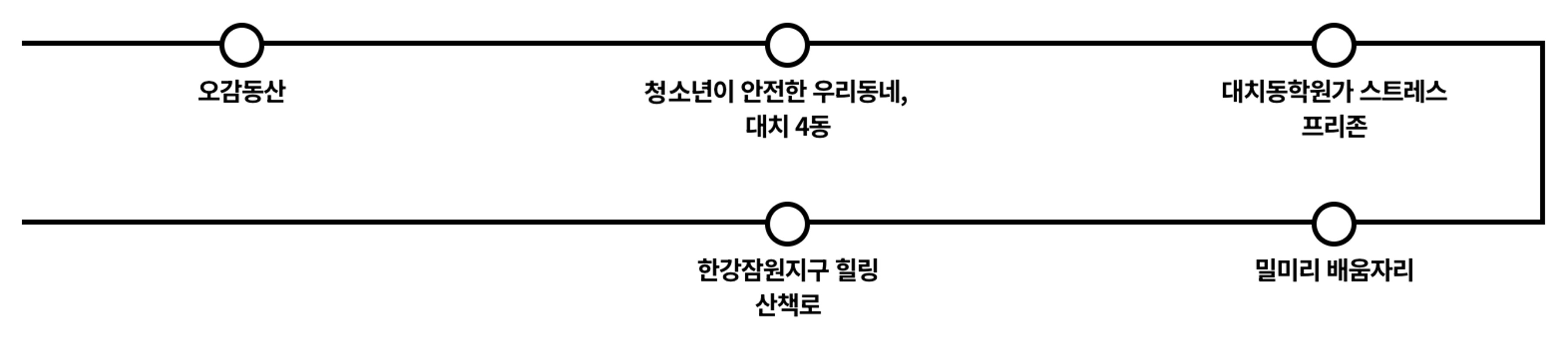 ‘공공디자인 힐링 로드’는 주민이 참여하는 공공디자인 과정을 통해 지역 문제에 해법을 제시하는 공간들로 구성된 코스다. 이동이 불편하고 멀리 나가는 것이 두려운 노인들이 집을 나와 가장 오랜 시간을 보내는 공공 장소에 ‘AIP(Aging In Place, 내집에서 나이 들기)’ 개념을 적용해 충분한 교류, 체험, 안전 보행이 가능하도록 한 ‘오감동산’에서 시작해, 청소년을 위한 생활안심 디자인과 스트레스 프리 디자인이 적용된 대치동 일원, 지역의 유휴 공간을 어린이 여가 공간으로 조성한 ‘밀미리 배움자리’, 그리고 길을 찾기 쉽고 걷기 좋은 도심 산책로 ‘한강잠원지구 힐링 산책로’까지 13km 구간에서 우리 생활에 밀착되어 있는 공공디자인을 만날 수 있다.
