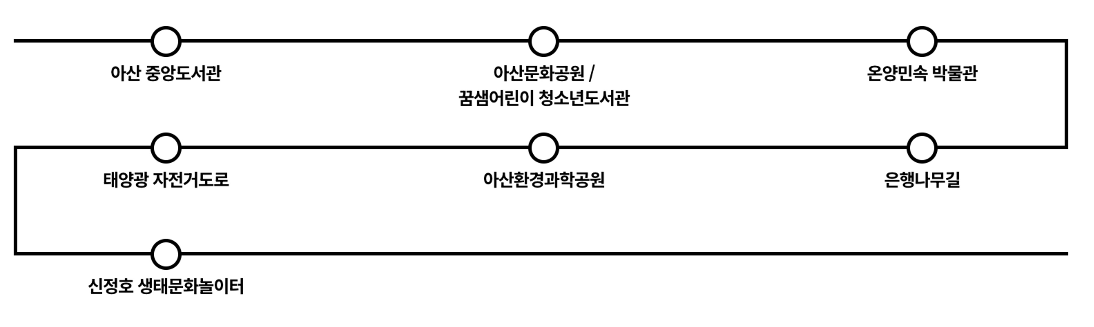 아산의 투어 코스는 자연·역사·문화 자원을 바탕으로 친환경 가치를 확산하는 공공 공간들로 구성되었다. 코스는 ‘패시브 공법Passive House*’을 적용해 국내 최초로 제로에너지 본인증을 획득한 ‘아산도서관’에서 출발하여, 한국인의 생활 문화를 수준 높은 콘텐츠로 경험할 수 있는 ‘온양민속박물관’, ‘전국의 아름다운 10대 가로수길’로 선정되어 있는 ‘은행나무길’로 이어진다. 또한 시민들의 여가 공간과 태양광 발전 시설을 결합한 ‘태양광 자전거도로’, 아름다운 자연 경관과 미디어아트, 증강현실(AR) 체험 등 첨단 기술을 결합한 도심 속 생태공원 ‘신정호 생태문화놀이터’ 등을 아산시 일대 17km 구간에서 경험할 수 있다.