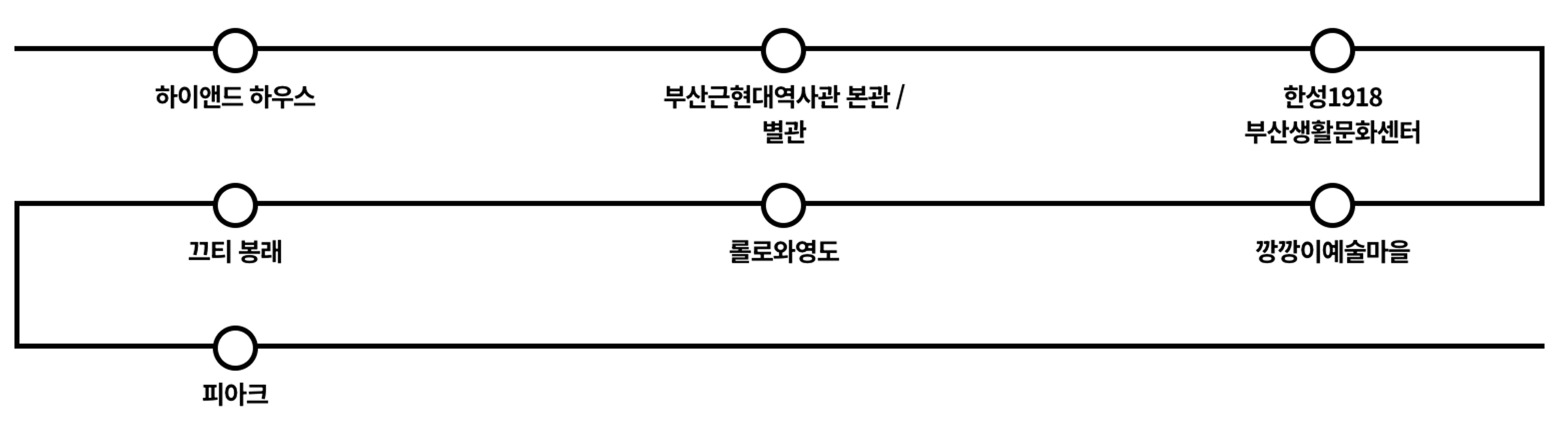 2023년 지역협력도시로 함께했던 부산의 여러 공공디자인 거점도 계속해서 공디페에 참여했다. 그 중 고유한 지역 자원을 활용한 공간과 골목 상권, 로컬 브랜드 8곳을 연결한 코스다. 유명 관광지 대신 마을의 역사, 전통시장, 산책로 등을 통해 지역을 경험하고 싶은 여행자들을 위한 집 ‘하이앤드 하우스’를 비롯해 녹슨 배의 표면을 벗겨내는 망치질 소리에서 유래한 별칭으로 불리는 ‘깡깡이예술마을’, 음식과 패션, 음악과 파티가 어우러져 영도의 라이프 스타일을 경험할 수 있는 ‘끄띠 봉래’, 옛 조선 수리 공장 일대에서 영도의 활성화를 이끈 초대형 복합문화공간 ‘피아크(P.ARK)’ 등으로 구성되어 있다.
