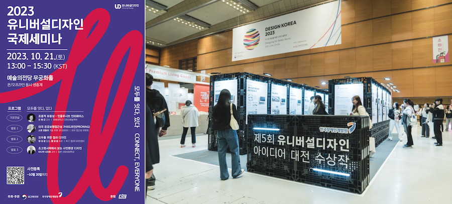 ‘모든 사회 구성원이 함께 차별 없이 시설물에 접근하고 이용할 수 있도록 하는’ 유니버설디자인에 주목한다는 소개 글처럼 유니버설디자인 국제세미나는 특히 공원, 광장, 보도, 거리, 도로 등 도시환경 부문에서 공공디자인에 파고든다. 올해는 ‘모두를 잇다, 있다’를 주제로 골랐다. 커브 경사로, 교통신호기 등의 기준을 소개하며 ‘미국 공공보행접근성 가이드라인’을 다룬 스콧 윈들리(미국 접근성 위원회 기술지원 코디네이터), 그리고 웨이파인딩 디자인을 소개하며 ‘공평한 정보’에 대한 중요성을 알린 ‘초고령사회에서 보는 사인환경 디자인’의 다나카 나오토(일본 시마네대학교 객원교수)의 발제 주제가 눈에 띈다. 2022년에는 ‘모두가 누리는 휴식’을 주제로 건축물과 공원 사례를 다룬 점과 달리 도시 환경적 측면에서 공평함을 정의하며 관련 제도나 지침의 중요성을 한층 더 강조했다. 유니버설디자인 국제세미나는 보건복지부와 한국장애인개발원이 추진하며 2017년부터 매년 열리고 있다.