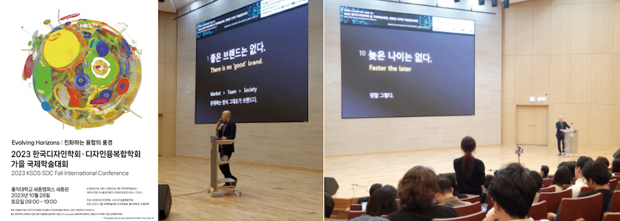2023 한국디자인학회 학술대회・디자인융복합학회 가을 국제학술대회 포스터와 봄에 열린 국제학술대회・대학생 디자인 학술발표대회 현장.