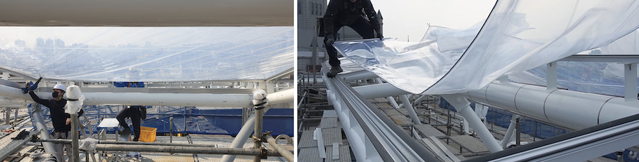 공사 현장에서 ETFE 필름 지붕을 설치하는 과정. 가볍고 유연한 ETFE 필름이 철골 프레임 위에 씌워지며 구름 형상의 상징적 구조물로 완성됐다.