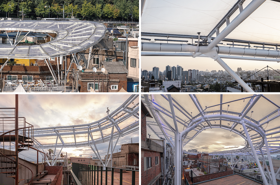 둥그런 모양이 구름을 연상케하는 구조물. 시장이 자리한 장소 뒤편으로는 서울의 상징인 남산이 보인다. 밤에는 은은한 조명으로 골목을 밝히고 남산의 야간 조명 색을 반사시킨다. 사진 출처: ©신재익, UIA건축사사무소