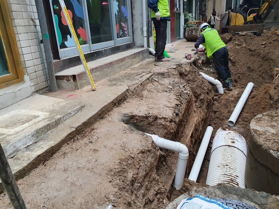 기둥을 세우기 위해 신흥시장 골목 바닥을 파내고 배수관을 교체, 정비하는 토목 공사 과정. 시장 환경 개선을 위한 기초 인프라 정비가 함께 이루어졌다.