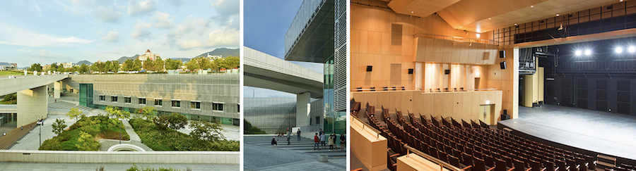 외부에서 바라본 광주 국립아시아문화전당의 모습과 2025 공공디자인 토론회가 열리는 문화정보원 건물 내 극장3 공간. 사진 출처: www.acc.go.kr