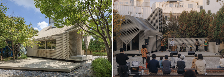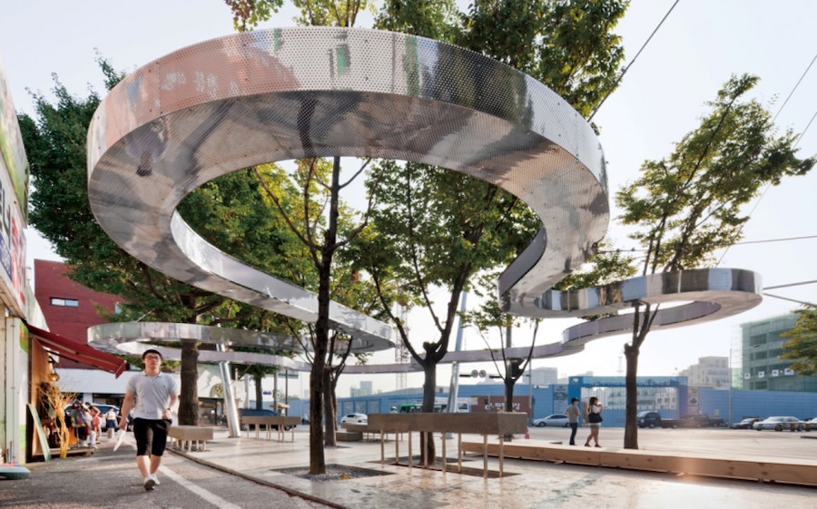 스페인 건축가 후안 헤레로스(Juan Herreros)는 광주 동구 장동 사거리에 있는 로터리를 작지만 매력적인 공원으로 변화시키는 ‘소통의 오두막’을 설계했다. 역동적인 시각적 즐거움을 선사하는 이곳에서 야외 버스킹 공연이 열린다. 사진 출처: gwangjufolly.org