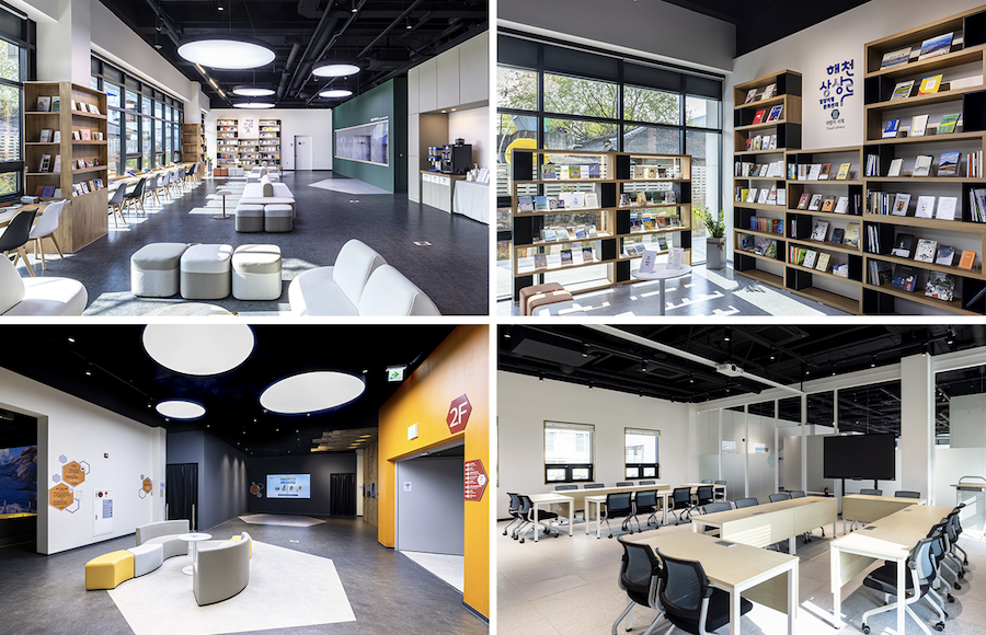 경북 공공디자인 거점인 밀양 해천상상루의 1층 환대공간에서는 밀양의 역사와 정보를 살펴보며 휴식을 취할 수 있다. 2층 빛놀이터에는 미디어 아트를 활용한 상설 전시가 마련되어 있고, 3층 소통공간에는 전시장과 공유 오피스, 해천 인근을 조망할 수 있는 전망대가 있어 밀양에 온 여행객을 위한 즐길 거리는 물론 밀양의 시민들과 예술가들이 서로 편히 교류할 수 있도록 공간을 조성해 놓았다. 사진 출처: sangsangru.or.kr