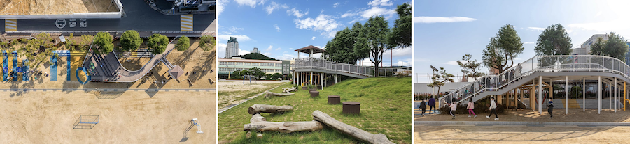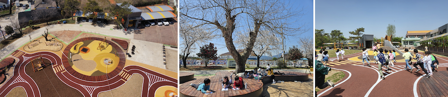 2021 최우수상(문화체육관광부 장관상)을 받은 ‘창원 대원초등학교 상상의 숲’. 건축사사무소 유니트유에이가 설계한 것으로 이동의 놀 권리를 옹호하기 위한 세이브더칠드런의 놀이터 조성 사업의 일환으로 추진되었다. 70m에 이르는 선형적인 공간을 연속적인 경험의 장소로 바꾸어 긴 형태의 순환 놀이 공간으로 구성했다. 사진 출처: 공공디자인 종합정보시스템