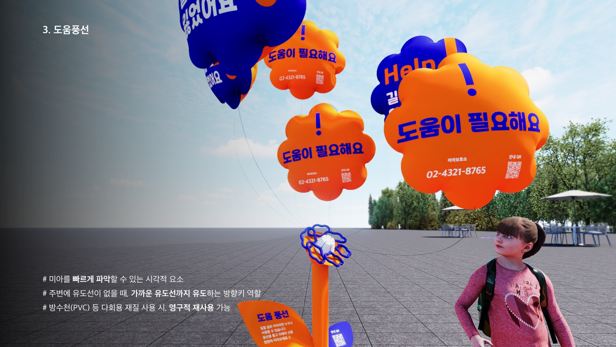 공공장소에서 길을 잃은 아이가 직접 미아보호소를 찾아갈 수 있는 유도선이다. 미아의 전진증후군을 고려하여 바닥면에 유도선을 표시하고, 중간에 쉴 수 있는 시설을 공간을 마련하여 쉽게 도움을 받을 수 있게 고안했다. 아이가 바닥면을 확인하지 못할 것을 고려하여 아이들의 흥미를 끌 수 있는 도움 풍선을 이용해 안전 지대로 자연스럽게 유도한다. 길을 잃은 혼란한 상황에서 아이 스스로 문제를 해결할 수 있는 방안이 될 수 있으리라 예상된다.
